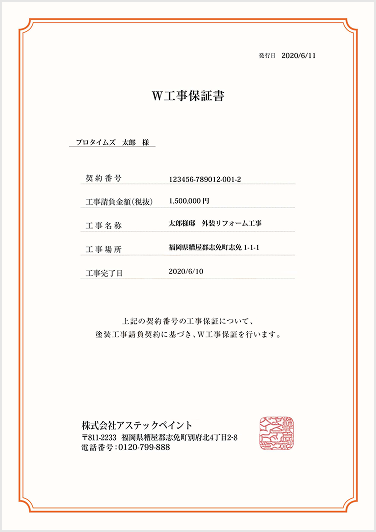アステックペイントでは、中低層アパート・マンションの修繕工事においてW工事保証による塗装工事の保証に加え、どんな工事でも1年間、工事保証をさせて頂いております。