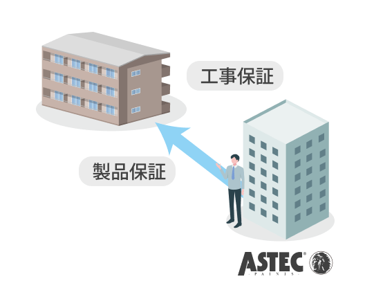 アステックペイントでは、高品質な塗料と施工を担保するため、製品保証と工事保証を発行しています。工事保証は、管理会社様の既存制度や物件特性に合わせ、最適な期間(最長10年)で柔軟に設定可能です。既存保証との整合を図りながら、オーナー様への提案力向上をサポートいたします。※保証の対象は工事に起因する不良事象に限ります。外壁壁の洗浄、貯水槽タンクの水質検・清掃、給水管内視鏡検査、側溝清掃、ドレン掃除等は保証の対象外です。
