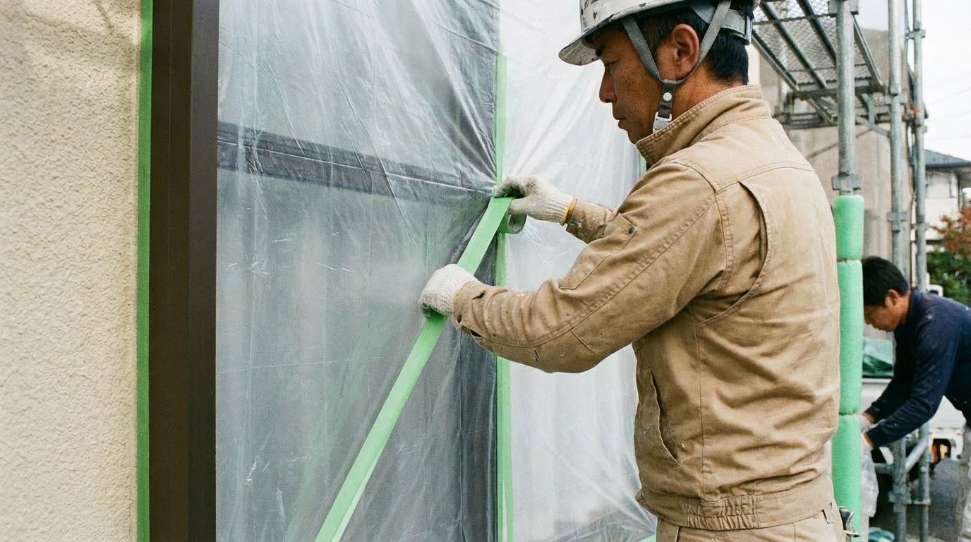 | 養生 | 窓・床・植栽物など塗料が付いてはいけない部分をシートで覆う | 塗料の飛散防止。周辺保護のため必須。 |