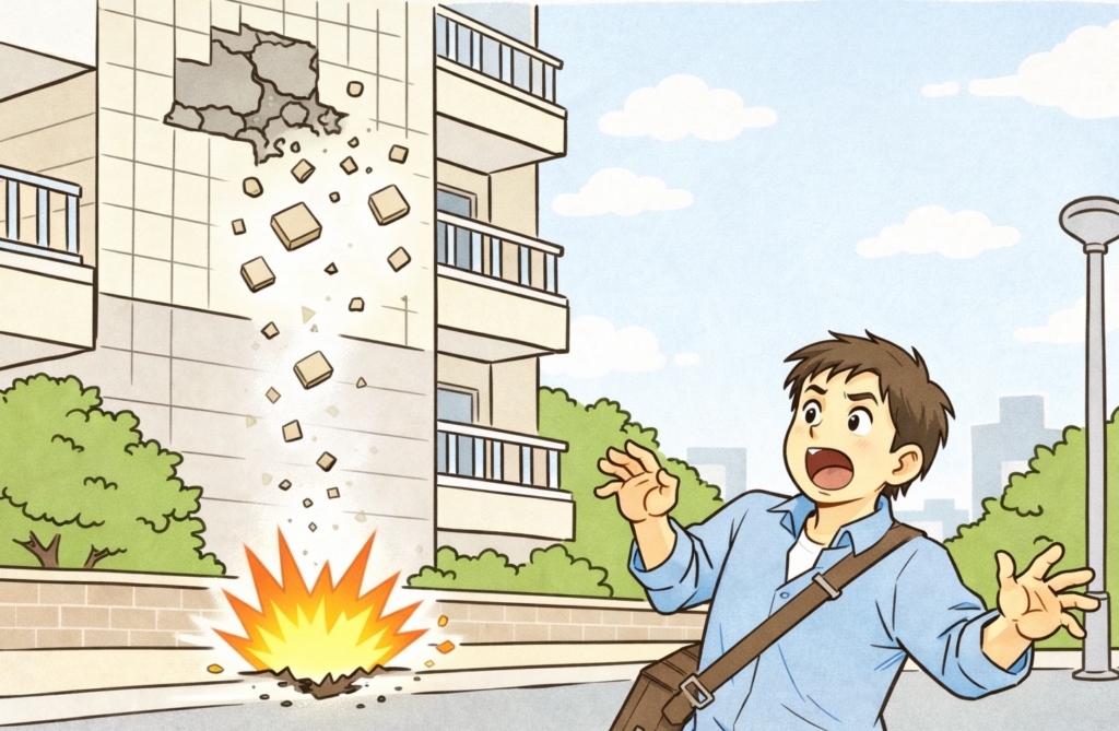 さらに恐ろしいのが、「タイルの剥落(はくらく)事故」です。 接着力が弱まったタイルが剥がれ落ち、通行人や居住者に当たれば、オーナー様は重大な「工作物責任(民法第717条)」を問われることになります。