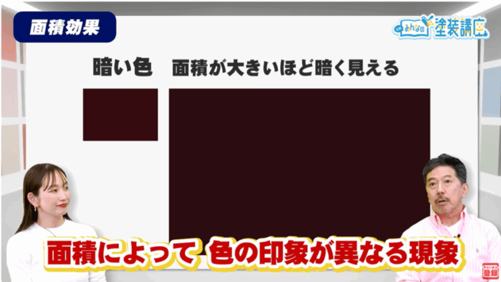 小さな色見本で見た色と、実際の建物に塗った時では、色の見え方が大きく異なります。これを「面積効果」と言います。