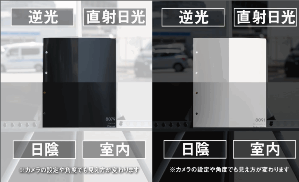 室内の照明下で見た色見本と、実際に屋外で太陽光に照らされた建物では、色の印象が大きく変わることがあります。特に濃い色や鮮やかな色ほど、この差が顕著に表れます。